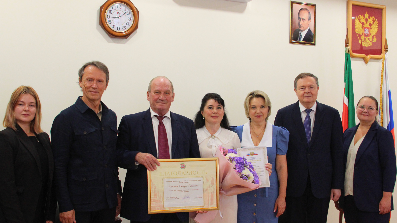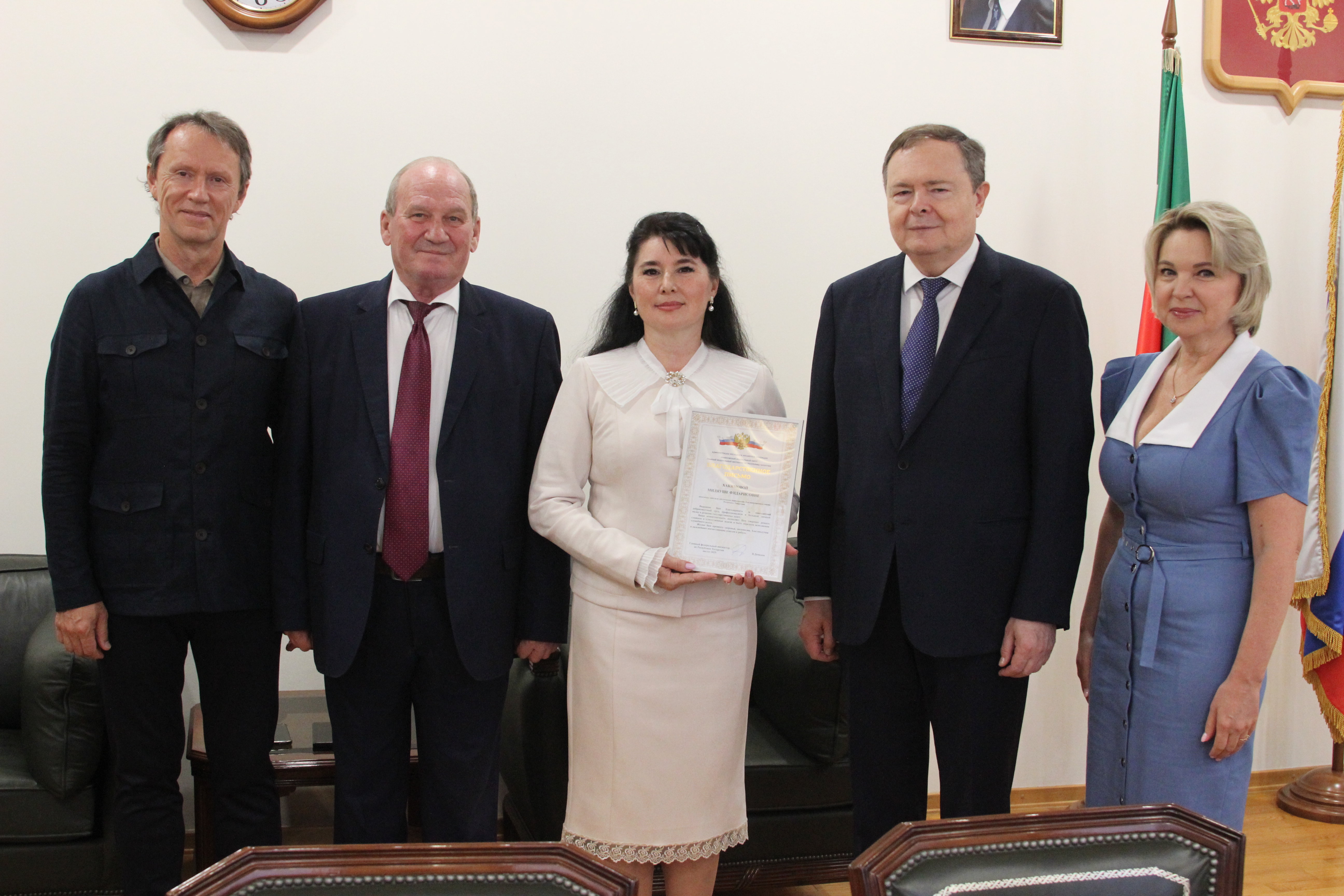 Не менее важной наградой стала Благодарность, объявленная Хакимовой Кабинетом Министров РТ. От имени Премьер-министра РТ награду вручил председатель Конституционного совета РТ Ильгиз Гилазов.